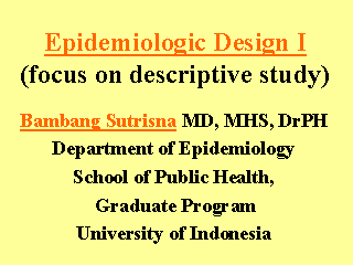 The purpose of Epidemiology are : 1. To diagnose community health problem 2. To identify natural history and etiology of f diseases 3. To evaluate and plan health services. In order to achieve the above purposes, it is critical to understand the basic types of Epidemiologic design. The adequate and appropriate epidemiologic design will give the correct answer.