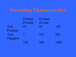 The sensitivity is 95% and the specificity is 95%. These are very good characteristics for a screening test. The positive predictive value in this instance is 67.9% (95/140). Of a 140 people that test positive, 95 will truly have disease. The negative predictive value in this instance is 99.4% (855/860). |