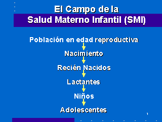 La salud materno infantil desarrolla sus acciones en un segmento del ciclo vital que engloba a poblaciones y momentos definidos a saber: la población en edad reproductiva (incluyendo a las mujeres embarazadas), el momento del nacimiento, los recién nacidos (etapa neonatal), los lactantes (hasta el primer año de vida), los niños (preescolares y escolares) y los adolescentes (de 10 a 19 años). |