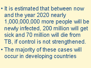 | The global burden of TB is inestimable. The majority of people getting TB will be those who can least afford weeks or months of sickness, the breadwinners of families who will die and leave unsupported dependents. |