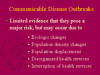 buried as soon as possible to reduce the risk for the spread of disease. - In most disaster situations, however, disease outbreaks are not the primary concern. It is the view of many disaster professionals that the risk for outbreaks will not lie immediately after an event, but 1-2 weeks later. They regard the treatment of the injured as receiving the highest priority, rather than the disposal of dead bodies. - This is not to say that disease outbreaks cannot occur following a disaster. Several changes brought about by a disaster may increase the risk for such an outbreak. These include changes affecting vector populations, changes in housing for humans, the destruction of the health care infrastructure, and the interruption of normal health services geared towards communicable diseases. Relief workers should take a survey of these factors following a disaster to determine if the environment is favorable for an outbreak. |