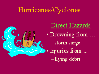 | The primary health hazard from hurricanes or cyclones lies in the risk for drowning from the storm surge associated with the landfall of the storm. Most deaths associated with hurricanes are drowning deaths. Secondarily, a hazard exists for injuries from flying debri due to the high winds. |