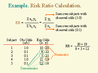 Here is an example of how to calculate the risk ratio when the control data were from the past. For each subject the observed odds and expected odds are listed. The numerator of the risk ratio is the sum of y’s over the subjects whose observed odds were (1:0), that is the first subject and the fourth subject (20+19=39). The denominator of the risk ratio is the sum of x’s over the subjects whose observed odds were (0:1), that is the second, the third and the fifth subject in this example. So the denominator is 8+5+12=25. Thus the risk ratio is 39/25 = 1.56.