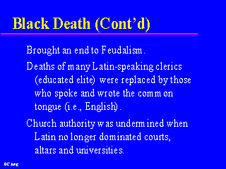 | This particular affliction had a great impact on what happened to Europe. It would take a plague to shake the pillars of authority during that time - the Church. Because the Plague was no respecter of persons, everyone succumbed. The Church exercised its authority by maintaining its communication through the use of Latin. When its clergy began to die off, they were replaced by people who spoke the common tongues. Without the Plague, this lecture could have been in Latin! |
