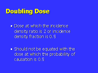 It is tempting to equate the doubling dose with the dose at which the probability of causation exceeds 50%. The doubling dose is the level of exposure (dose) for which the exposed are twice as likely to have disease as the unexposed. |
