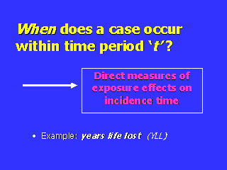 Assuming the weight of the evidence suggests a causal relation between exposure and disease, we can use epidemiologic data to quantify the impact of exposure. Direct measures of exposure effects on incidence time, such as the expected years of life lost (YLL), may be used when asking how much earlier a case occurs in time 't'. |
