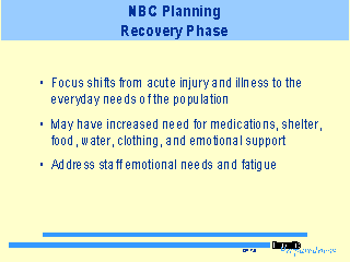 During recovery, the focus of disaster response shifts away from the acute injuries and illnesses caused by the disaster to the everyday needs of the general population. The impacted population may have increased needs for medication, shelter, food, water, clothing, and emotional support that must be addressed. Hospitals must also contend with the emotional needs and fatigue of their own personnel. |