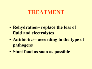 dehydration should be treated with IV solution. Mutiple antibiotic resistance is a growing problem in many countries. Therefore, antibiotics should be chosen according to the sensitivity pattern of the organism. Food should be started as soon as the patient can eat. Complete withdrawal of food during diarrhea is not recommended. Breastfeeding should be continued throughout the course of diarrhea. Extra protein intake is needed during and after some diarrheal diseases, for example shigellosis. |