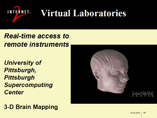 of various applications already in use: This application links an MRI machine with a supercomputer to produce 3-D visualizations of the neurons in a patient’s brain firing in real-time. The resulting animation can be viewed by any doctor that has access to high-performance networking. These capabilities transform the process of visualizing a patient’s brain - a process that normally takes days - and allows doctor’s to work in ways not previously possible. |