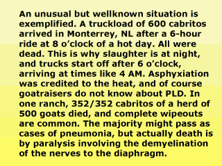 | Also note that many cabritos have swollen lymph glands (“bolcitos”) in the neck. Amazingly, slaughterhouse workers take this as a sign of good health. If such cabritos did not get to market, some would die of CL undetected. Rarely indeed, one may show hindleg paralysis. |
