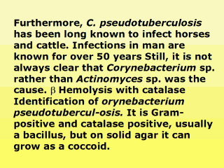 | If it came from a lesion of sheep or goats, or even cattle and horses, and produces PLD, it is C. pseudotuberculosis (Cps). C. ulcerans is an apparent synonym of Cps The 8 combinations of (± nitrate) x (± starch) x (± pyrazinamide) are not at the species level, yet demand further investigation so that Cps metabolic pathways can more certainly identify it. |
