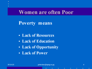| Poverty is not just about money. Where everyone is poor, then women will be at even worse advantage. The education of women is the most important issue in improving health and welfare in poor countries. The evidence - viz. Kerala, is that even when a state is poor a literate population can cope better and achieve better health for all - in particular a literate female population will control fertility, educate children and manage better. |