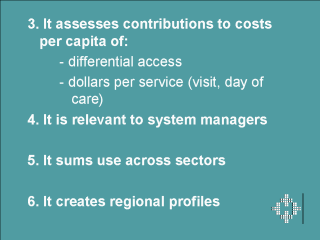 an assessment of how each of these factors interacts in determining cost per resident. 4. Indicators are valuable to health care system managers because they distinguish among medical, surgical, pediatric, psychiatric, and obstetric admissions. 5. POPULIS permits usage to be summed across sectors, using a dollar figure where possible, and for hospitals or nursing homes, summing total days of chronic institutional care. 6. Regional profiles show how each region’s health, socioeconomic risk, & health care use characteristics differ. |