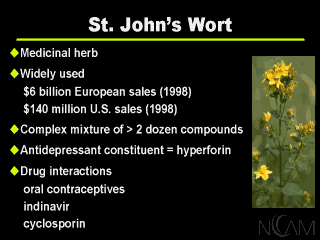 conditions. Like all plants, it’s a complex mixture of many chemical constituents. We know that at least one of those constituents, hyperforin, contributes to its antidepressant action, and we have learned that St. John’s Wort, while it may be active in depression and other clinical conditions, also interacts with drugs: birth control pills, AIDS drugs, and drugs important for preserving the survival of transplanted organs. Now, it’s the background suggesting that St. John’s Wort was effective for depression that led my colleagues in 1998 to begin to design a study that has been conducted and, as I said, completed. Let me give you a sense of the background data and how it evolves in this somewhat contentious field. |