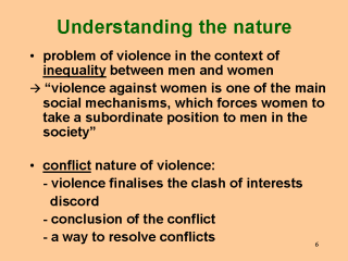 against women. Declaration on Elimination of Violence against Women proclaimed by the Resolution 48/104 of the General Assembly on the 20th of December 1993. This means that international organisations recognise a direct relation between the problem of violence against women and inequality between men and women. Thus countries which signed the Declaration on the Elimination of Violence against Women must address the inequality between men and women. This is difficult in some countries because of deeply rooted social and cultural traditions, which restrict women’s rights. *** It is difficult to imagine a society, where there are no conflicts and difference of interests on different levels, including interpersonal levels. The positive role of conflicts in the development of a society cannot be doubted. In the family it is also impossible to avoid conflicts caused by the assignment of duties, responsibilities, and power. In the majority of cases conflicts conclude with the development of certain agreements, which each party tries to follow. However, in some cases conflict conclude in violence against woman. |
