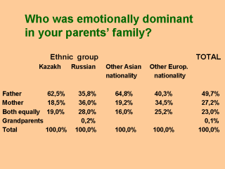 | According to the responses received, in general, fathers were dominant in half of parental families. Moreover, father’s role in Kazakh and other Asian families was more significant and important than in families of other ethnic groups. At the same time respondents noted that their mothers took more significant part in their upbringing than fathers did. |