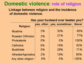 prevalent in Muslim families than in Christian or atheist families. N o conclusion can be made determining the influence of religion on domestic violence, since there is a close link between ethnic origin and religion, i.e., most Kazakh people are Muslims, the majority of Russians are Christians. Analysis of the independent influence of these indicators (ethnic origin and religion) indicates the following: at present ethnic origin has stronger influence on the incidence of domestic violence.Analysis of the findings allows us making the following conclusions: If in the parental family there were relations between mother and father, in which there was no explicit superiority of one parent, then in her own family life a woman is less likely to be exposed to domestic violence. If both parents took an equal part in raising their daughter, then she is less likely to suffer domestic violence. Frequent quarrels in the parental family are one of the risk factors of violence against a woman. All this leads us to state that the environment, in which children are raised, is very important. Equal effort and commitment (emotional, financial), equal participation in the children’s education is one of the factors, which decrease the risk of future domestic violence. A person develops behaviour patterns and skills for solving family problems during childhood. |