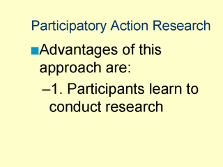 The goal of this type of research approach is to train and to empower community residents in order that they can and will continue to foster programs in injury prevention as their community needs change, as resources change, and as injury patterns change. |