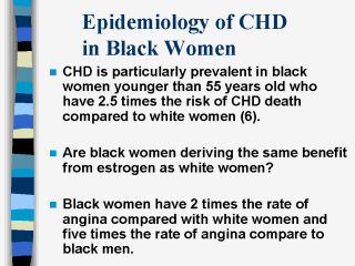| The incidence of CHD in black women is second only to white males. Whereas the protective effects of estrogen are thought to protect white women from developing CHD in their pre-menopausal years, this advantage does not seem to extend to black women. It has also been reported that in African women, a resting heart rate of greater than 84 beats per minute carries a threefold increase in mortality risk over those women with a heart rate less than 74 (2). |