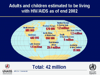 | This picture shows the global distribution of HIV as of the end of 2002. An estimated 42 million persons are infected with HIV worldwide. Unfortunately, like most other scourges and infectious diseases, the burden of the disease is the highest in countries and regions most ill equipped and least resourceful to combat it. The most resource poor countries of sub-Saharan Africa and South and SE Asia are the worst hit areas. |