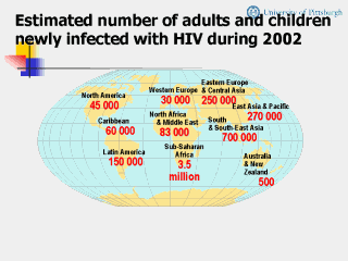 | In 2002 alone, the number of new HIV infections was a staggering 5 million. Again, the preponderance of these infections was in sub-saharan Africa followed by south and SE Asia. |