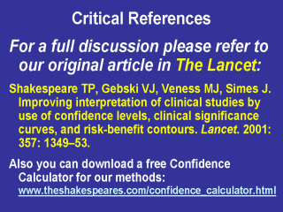 1. Shakespeare TP, Gebski VJ, Veness MJ, Simes J. Improving interpretation of clinical studies by use of confidence levels, clinical significance curves, and risk-benefit contours. Lancet. 2001: 357: 1349–53.