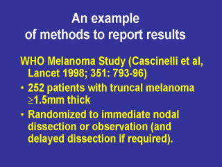 A good example is the WHO melanoma study published in the Lancet (Ref 20). They randomized 252 patients with truncal melanoma to immediate dissection versus observation and dissection delayed until relapse. 20. Cascinelli N, Morabito A, Santinami M, MacKie RM, Belli F, on behalf of the WHO Melanoma Programme. Immediate or delayed dissection of regional nodes in patients with melanoma of the trunk: a randomised trial. Lancet 1998; 351: 793–6. |
