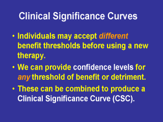 Individuals may accept different benefit thresholds before using a new therapy. We can provide confidence levels for any threshold of benefit or detriment. These can be combined to produce a Clinical Significance Curve (CSC). Clinical significance curves are formed by calculating the level of confidence associated with any magnitude of benefit or detriment. |