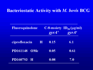 | When we compared the two compounds for bacteriostatic activity with M. bovis BCG, we found little difference when wild-type cells were examined (gyrA+). However, the methoxy compound was about ten times more active than the C-8-H compound when a resistant gyrase mutant was examined. Ciprofloxacin, a C-8-H compound, was included in the experiment as a reference compound (8). |