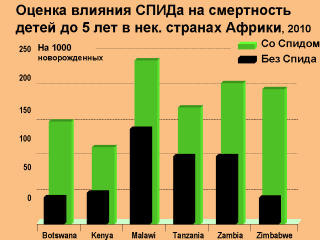 Страны, которые достигли низкой младенческой смертности (< 50 на 1000) как Зимбабве и Ботсвана, благодаря дородовым услугам, очистке воды и программам иммунизации, испытывают наиболее отрицательное воздействие от СПИДа с 4-7 кратным увеличениями в смертности в возрасте от 0 до 5. У других стран с более высокой детской смертностью на долю СПИДа приходится 2 кратный рост смертности в возрасте от 0 до 5. Автор Слайда: Марк