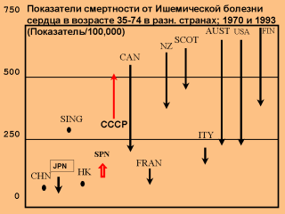 Представленный слайд показывает, что страны бывшего Советского Союза в отличие от многих других испытывают рост смертности из-за сердечно-сосудистых заболеваний. Главная причина этой тенденции - неполадки в системе здравоохранения в бывшем Советском Союзе. Source:NIH, SAAUST: Australia, CAN: Canada, CHN: China, E&W: England and Wales, FIN: Finland, FRAN: France, HK: Hong Kong, NZ: ITY: Italy, JPN: Japan, New Zealand, SING: Singapore, SCOT: Scotland, SPN: Spain http://www.pitt.edu/~super1/lecture/lec4091/006.htm Dr. Ueshima, Professor and Chairman, Department of Health Science, Shiga University Medical Science, Japan |