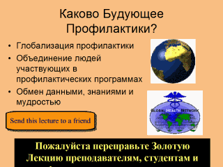 После прочтения этой лекции, пожалуйста, отправьте ее по крайней мере 10 людям в вашей стране. Мы хотим, чтобы Вы "инфицировали" своих друзей и вашу страну идеей Интернет-профилактики. Чтобы присоединится к Глобальному проекту Суперкурса, пожалуйста, предоставьте информацию о себе на следующем вебсайте http://www.pitt.edu/~super1/assist/join.htm или по электронной почте super1@pitt.edu. Мы, в проекте Суперкурс, ожидаем сотрудничества с Вами! Согласно китайской поговорке, "Поездка на тысячу миль начинается с первого шага" (прислал Чандра Пандав, Индия). Так и эта лекция служит началом будущих лекций по профилактике, которые группа Суперкурса будет публиковать по крайней мере один раз в год.