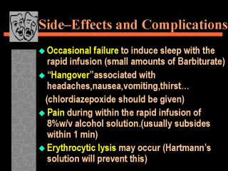 In its ability to reduce intracranial preure alcohol may an appropriate anesthetic in patients with elevated intracranial tension.Because of its peripheral vasodilating action, intravenouse alcohol may facilate the induction of hypothermia.Alcohol may protect aginst arrhythmias encountered at low body temperatures.IV alcohol can be most beneficial in the anesthetic amnagement of the alcoholic patient in whom pre- or postoperative alcohol deprivation may precipitate acute withdrawal symptoms.The successful use of IVA treatmnet of barbiturate poisoning was also reported.
