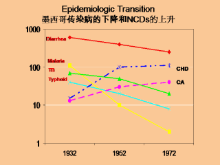 epidemiologic transition 在上个世纪已被大多数国家所注意。在墨西哥, 几乎所有的传染病已得到了减少, 伴随着传染病的减少,平均寿命上升, CHD 和 CA问题被暴露出来。 以上展示了在群体疾病体系的变化。