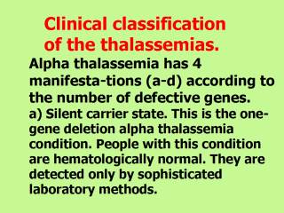 a mild anemia, confusable with simple iron deficiency anemia. c) Hemoglobin H disease. These patients have lost 3 alpha globin genes. The result is a severe anemia, with small, misshapen red cells and their fragments. These patients typically have enlarged spleens. Bony abnormalities particularly involving the cheeks and forehead are often striking. The bone marrow tries to compensate for the anemia. As a result, the marrow cavity within the bones is loaded with red cell precursors. These RBC populations gradually cause the bone to flair out. Patients with hemoglobin H disease also develop large spleens since the spleen has blood-forming cells. These cells become hyperactive and overexpand, just as those of the bone marrow. The result is a spleen that is often 10 times larger than normal. Patients with hemoglobin H disease often are small and appear malnourished, despite good food intake. This feature results from the tremendous amount of energy that goes into the production of new red cells at an extremely accelerated pace. The constant burning of energy by these patients mimics intense aerobic exercise; exercise that goes on for every minute of every day. d) Hydrops fetalis. This condition results from the loss of all 4 alpha globin genes. The affected individual usually succumbs to the severe anemia and complications before birth. |