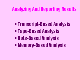 strategies in focus groups: Transcript-Based Analysis--transcripts are the primary data source. This strategy produces the most depth and detail; but is very time-consuming. It can take, depending on the topic, between 10-16 hours per focus group in analyzing and preparing the report. Tape-Based Analysis--here the tapes are the main source of data. You need to listen to the tapes, review the other data, prepare a shortened transcript of the most relevant discussion, and prepare a brief summary for each focus group. This approach requires between 6 and 10 hours. Note-Based Analysis--the primary data source is the field notes taken during the sessions. The moderator and the assistant moderator debrief following each session, using the tapes and other materials, a summary is prepared for each focus group, and then a composite analysis report for the full set of groups is prepared. This approach may require 3-4 hours per focus group. Memory-Based Analysis--the primary source is the moderators memory of the discussion, sometimes augmented by field notes. This type of analysis is most of the time presented orally, immediately following each focus group. The advantage is the immediacy and speed with which it can be provided. The oral presentation last about an hour for each focus group. |