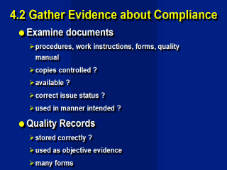 Procedures, work instructions, forms, test reports, any documents which are involved in a testing process, should be examined for compliance and document control. Controlled copies should be available to appropriate people. These copies must be of the correct issue status and being used in the manner intended. Quality records must be in compliance with the instructions given in the relevant procedure/ work instruction and be stored according to the documented procedures. Examining quality records is a means of confirming that processes have been correctly completed and can be used to obtain objective evidence in vertical audits. Remember that quality records may be in the form of control charts and test reports. |