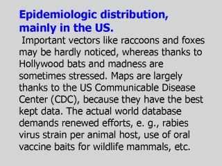 | Cases of rabies in humans in 1990-2002 in the US are rare with zero in Hawaii. Dog bites are of course the main source of infections. Curiously, although bats represent a minor fraction of the total reservoir of rabies in the US, since 1990 a total of 27 (93%) of the 29 human cases of rabies have been associated with insectavor bat rabies virus variants, e. g., with the silver-haired bat/eastern pipistrelle virus variant predominating. |