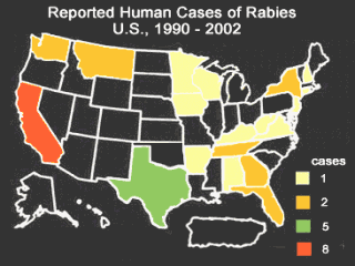 | The canine reservoir for rabies is rather high in Texas, yet low in western US with a total in 2001 of 96 cases. Why were there 8 cases in California? The left lower territory is ofcourse Alaska an the right lower one Pueto Rico. |