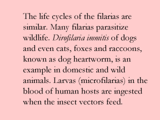 | Within the vector, the microfilarias migrate to specific sites and develop from first-stage larvas into infective third-stage larvas. The vector transmits the infective larvas into a human host when feeding. The worm molts twice more to become an adult worm that may be found in the lymphatic vessels, lymph nodes, subcutaneous tissue or the body cavity. |