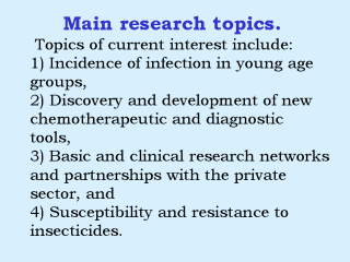 | Studies on the geographical distribution of house infestation by Rhodnius prolixus and Triatoma dimidiata and others like T. infestans and T. gerstaeckeri are being conducted to allow control programs to focus activities on particular geographical areas. Other studies are looking at the mobility and genetics of non-domiciliated triatomines to help evaluate efficacy of insecticides, and vector behavior to permit control of domiciliary insects, while evaluating the risks. |