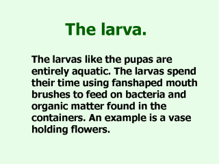 at the water’s surface, this mosquito hangs vertically. Larvas swim smoothly like a