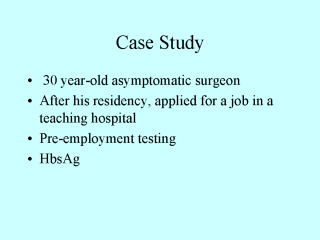 A 30 year-old surgeon just finished his residency and applied for a job in a large urban teaching hospital. He was asymptomatic and had no prior diseases. Yet on his pre-employment examination he tested positive for hepatitis B. His surface antigen was positive (HbsAg+) showing that he was a carrier. |