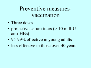 The vaccine for hepatitis B is 95-99% effective in young adults. If given over 3 doses (4-5 doses) then another 50% of those who did not respond may respond to the further doses. Therefore it may be prudent to test HCWs for protective serum titers after the three doses and then give further treatment if necessary. Those over age 40 are less likely to respond to the vaccine. |