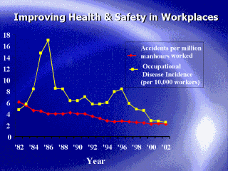| Improving trends in occupational safety and health over the years have seen the occupational disease incidence come down to 2.5 per 10,000 employed persons in 2002, with the accident frequency rate at 2.2 per million manhours. |