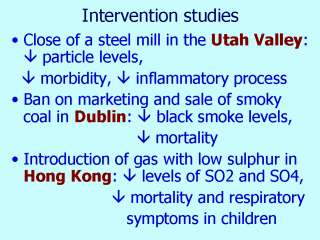 | Intervention studies Some studies illustrate the potential health benefits of policies and actions oriented to decrease the exposure to air pollution. Several years ago, Pope showed that in Utah Valley, closure of an open-earth steel mill over the winter of 1987 was associated with reductions in respiratory disease and related hospital admissions among valley residents (Pope, 1996). In a later investigation, Dye et al (2001) analysed composition of filters originally collected near the steel mill during the winter of 1986 (before closure), 1987 (during closure), and 1988 (after plant reopening). The authors found a higher quantity of sulphate and certain metals (i.e., copper, zinc, iron, lead, strontium, arsenic, manganese, nickel) in the 1986 and 1988 filters. They intratracheally instilled liquid extracts from filters to rats, finding that rats exposed to 1986 or 1988 extracts developed significant pulmonary injury and neutrophilic inflammation suggesting that sulphate or metals may be important determinants of the pulmonary toxicity observed (Dye et al., 2001). Clancy and colleagues evaluated the effect of air pollution control and death rates in Dublin (Clancy et al., 2002). After the ban, a clear reduction (70 per cent) of black smoke concentrations was observed. Subsequently, organic causes death rates decreased by 5.7 per cent, cardiovascular deaths by 10.3 per cent, and respiratory ones by 15.5 per cent, showing similar impact estimates than cohort studies. Another intervention study has focused on changes in air quality and death rates after a restriction on sulphur content in Hong Kong (Hedley et al., 2002) . The first year after intervention, both SO2 and sulphates showed a clear reduction. Two years after the restriction, SO2 maintained low levels; however, sulphate concentrations rose again and stabilised, probably, as suggested by the authors, as part of the regional pattern of sulphate pollution in southern China. Death rates showed a substantial reduction in the first 12 months, but a peak in the second winter after intervention. Considering years 3 to 5 after intervention, average annual trend decreased significantly in a 2.1 per cent for all causes, and 3.9 per cent for respiratory ones. |
