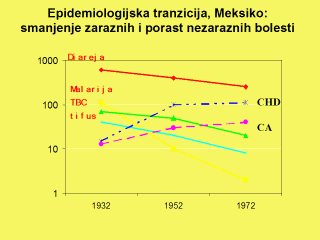 Epidemiologijska tranzicija nije ograničena samo na razvijene zemlje. Dokazi o postojanju epidemiologijske tranzicije mogu se pronaći i u zemljama poput Meksika. Epidemiologijska tranzicija je jasno uočljiva u većini zemalja u prošlom stoljeću. U Meksiku je reducirana većina zaraznih bolesti, a također je porastao očekivani živaotni vijek, pojavile su se kronične srčane bolesti. To demonstrira sustave bolesti bazirane na populaciji. |