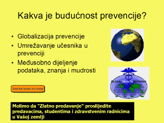 Kako se pridružiti Globalnoj zdravstvenoj mreži? Molimo Vas da ovo predavanje nakon čitanja proslijedite barem desetorici u Vašoj zemlji, kao i naše adrese naših web-stranica. Željeli bismo da svoje prijatelje i zemlju "inficirate" prevencijom temeljenom na Internetu. Želite li se pridružiti Supercourse projektu Globalne zdravstvene mreže, unesite svoje podatke preko web-stranica http://www.pitt.edu/~super1/assist/join.htm ili pošaljite e-mail na Mi nosioci projekta Supercourse unaprijed se radujemo suradnji s Vama! Kako kaže kineska poslovica, "put od tisuću milja počinje prvim korakom" (Chira Piav, India). Ovo predavanje ima upravo tu zadaću - započeti buduća predavanja o prevenciji koje će Supercourse grupa slati bar jednom godišnje. Napomena: tipka "send this lecture to a friend" radi u PowerPoint slide show načinu rada |