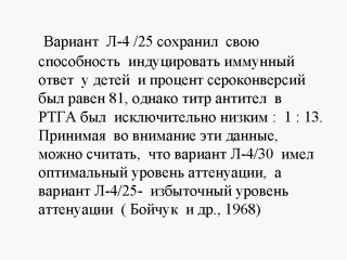 | Вариант Л-14, который был изолирован прямо от пациента в культуре фибробластов куриного эмбриона, полностью потерял свою реактогенность и иммуногенность после 18 пассажей в этой культуре. Количество сероконверсий достигало только 9%, и титр антител в РТГА не определялся. Вариант Л-14 рассматривался как вариант с избыточным уровнем аттенуации и был забракован. ( Бойчук и др., 1968) |