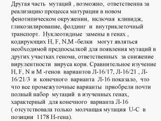 кодирующем вирусспецифическую полимеразу. Для того чтобы изучить роль мутаций в гене, кодирующем вирусную полимеразу в процессе аттенуации была исследована нуклеотидная последовательность L-генов десяти диких и вакцинных штаммов ( Bankamp et al., 1997). Среди исследованных штаммов были дикие штаммы , изолированные во время коревых вспышек в США в 1989- 1991 гг., вакцинный штамм Шварц, а также дикий штамм Edmonston. Анализ нуклеотидной последовательности L-генов 4- х недавно изолированных штаммов и дикого штамма Edmonston выявил высокую степень консервативности этого гена: 2,4% изменений на нуклеотидном уровне и 1,1 % на аминокислотном уровне между наиболее генетически удаленными последовательностями. Чтобы проанализировать функциональные различия между L-генами вакцинных и диких штам-мов , полимеразные L- белки были экспрессированы в животных клетках, однако эти отличия были минимальными (Bankamp et al., 1999). Изучение последовательностей L- генов вакцинных штаммов вируса кори впервые позволило выдвинуть предположение о том, что различные комбинации мутаций в одних и тех же генах могут приводить к аттенуации вируса кори. |